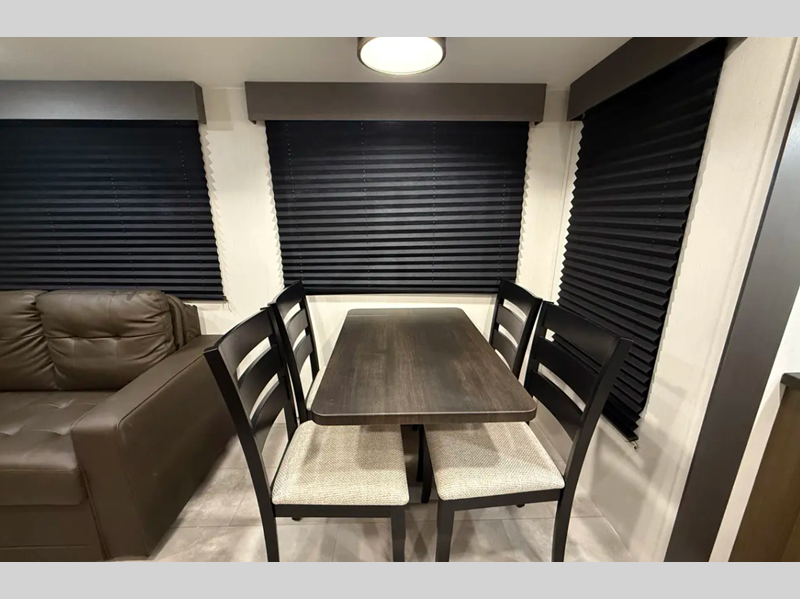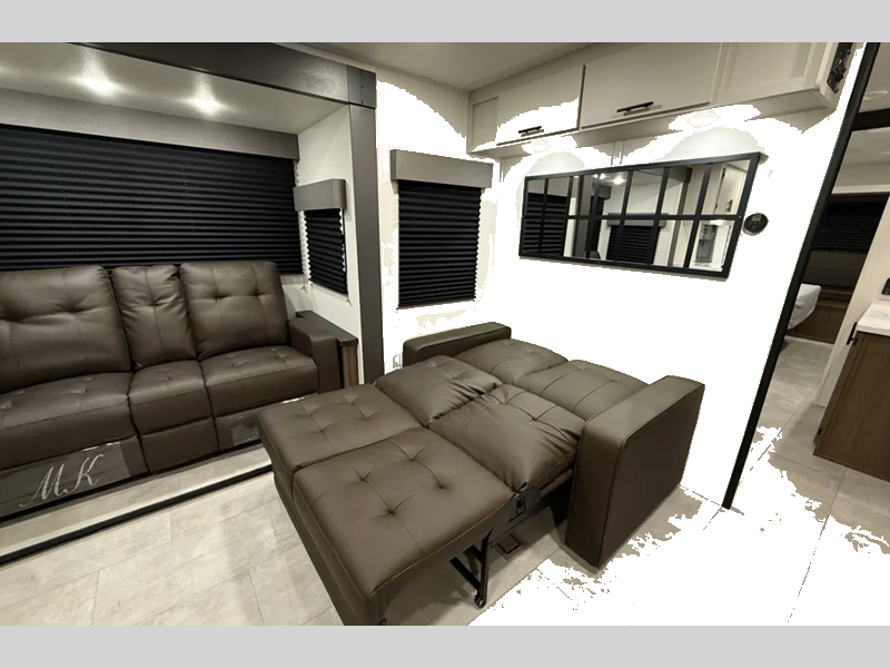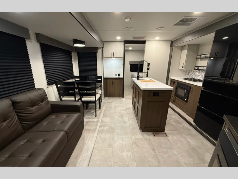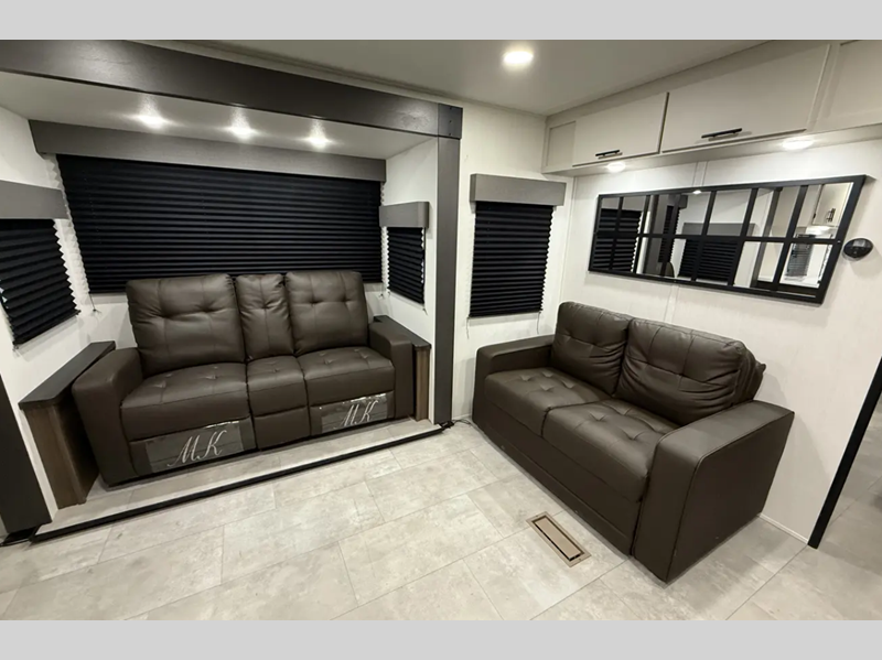 The exterior comes outfitted with welded aluminum framing, power awnings with LED lights, a fully enclosed underbelly, high density foam block insulation, Tufflex PVC Roof, and a tankless water heater. There are quite a few appliances that you'll find yourself using just about every day, like the Smart TVs, the soundbar, and 30" microwave oven for all of your cooking needs, plus two 15,000 BTU air conditioners so your inside temperature can keep your comfortable both day and night.